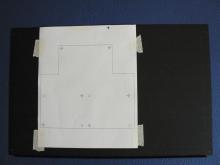 Place the bottom cover with the front lip up and towards you as shown on the picture. Cut out the PSU drill template and stick it to the bottom cover. Make sure to align the top right angle of the drill template with that of the bottom cover. Check that double circled holes on the template align with the cover holes.